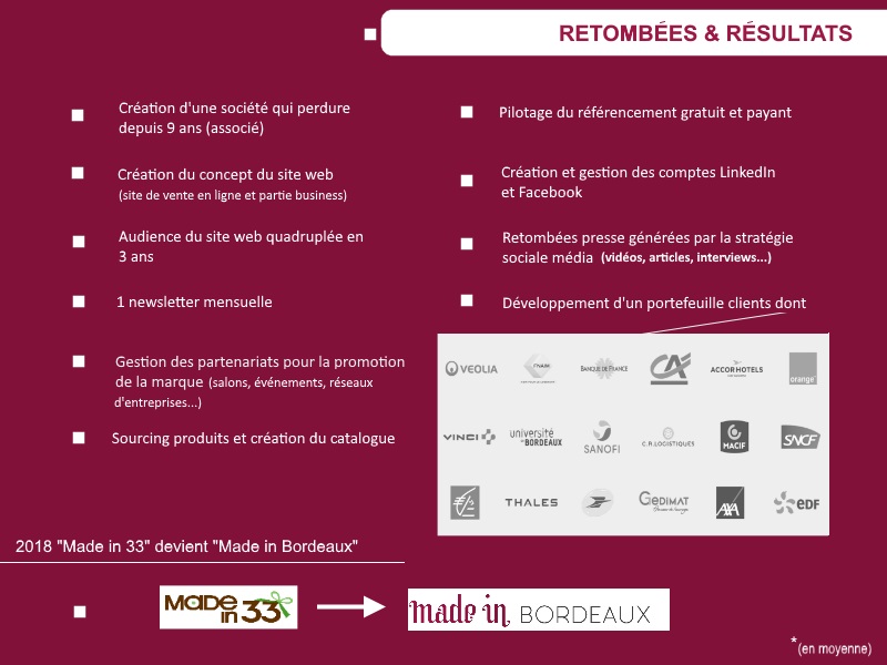Créer « Made in Bordeaux » (Made in 33 en 2010), avec Patricia Zaldain, fut une exceptionnelle expérience. Tant par la mise en place de l’ensemble des outils marketing nécessaire à la création d’une société, que par la découverte d’un territoire/terroir riche en produits de toutes sortes, que nous avons souhaité faire découvrir au plus grand nombre (professionnels et particuliers)