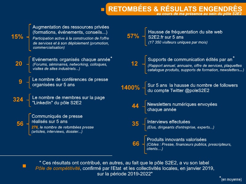 Mission : « Dès mon arrivée en 2013, j’ai construit, en accord avec la direction, et mis en place le plan d’actions marketing / communication visant à promouvoir l’offre de services du pôle S2E2 et à améliorer sa visibilité, ainsi que celle de l’activité de ses membres en France et à l’international »